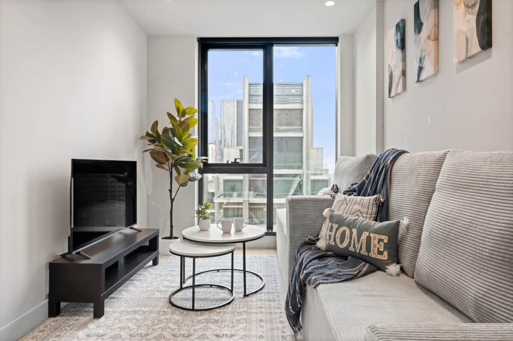 The living room is bright, modern, and designed for comfort — featuring a cosy sofa, Smart TV, and a light-filled open-plan layout that flows into the dining and kitchen area. It’s the perfect space to unwind after a day exploring Melbourne